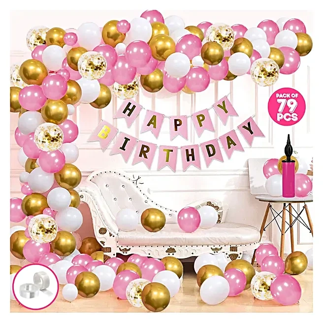 Total 100 rose gold metallic and white colored balloons.