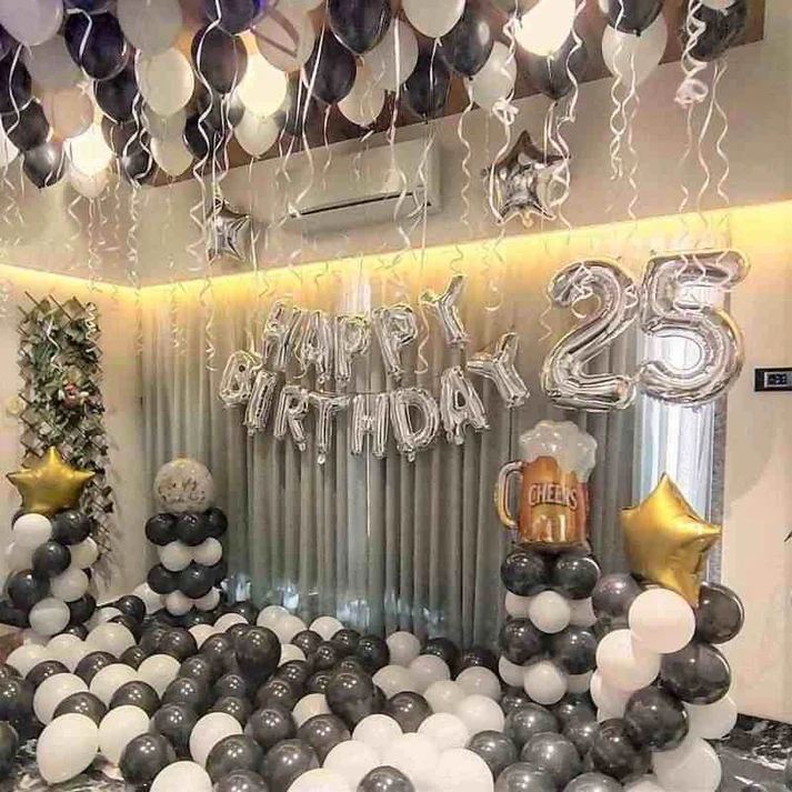 Total 200 silver metallic and black colored balloons.