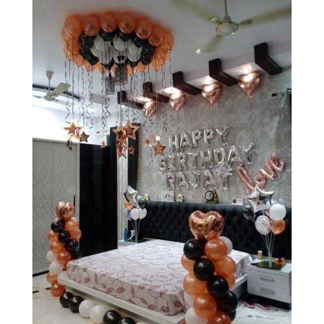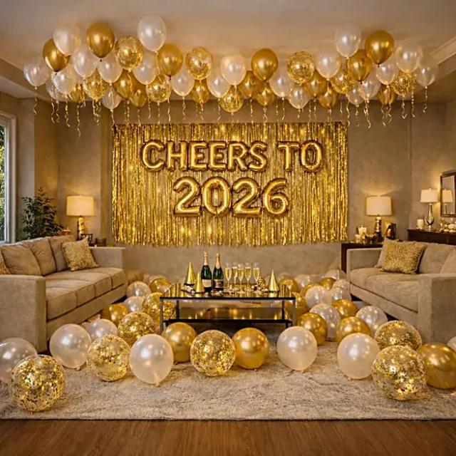 Air-filled balloons (black, gold, chrome & confetti mix): 120–150