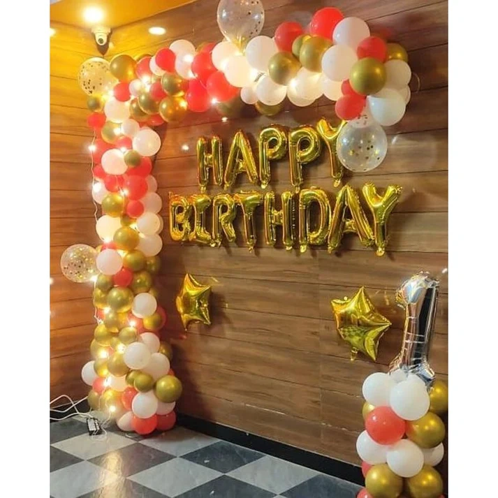 •150 balloons in arc with around 35 chrome golden balloons