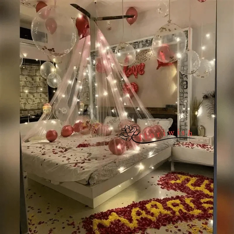 •Just Married Red and Yellow Flower Petal Decorated on Floor