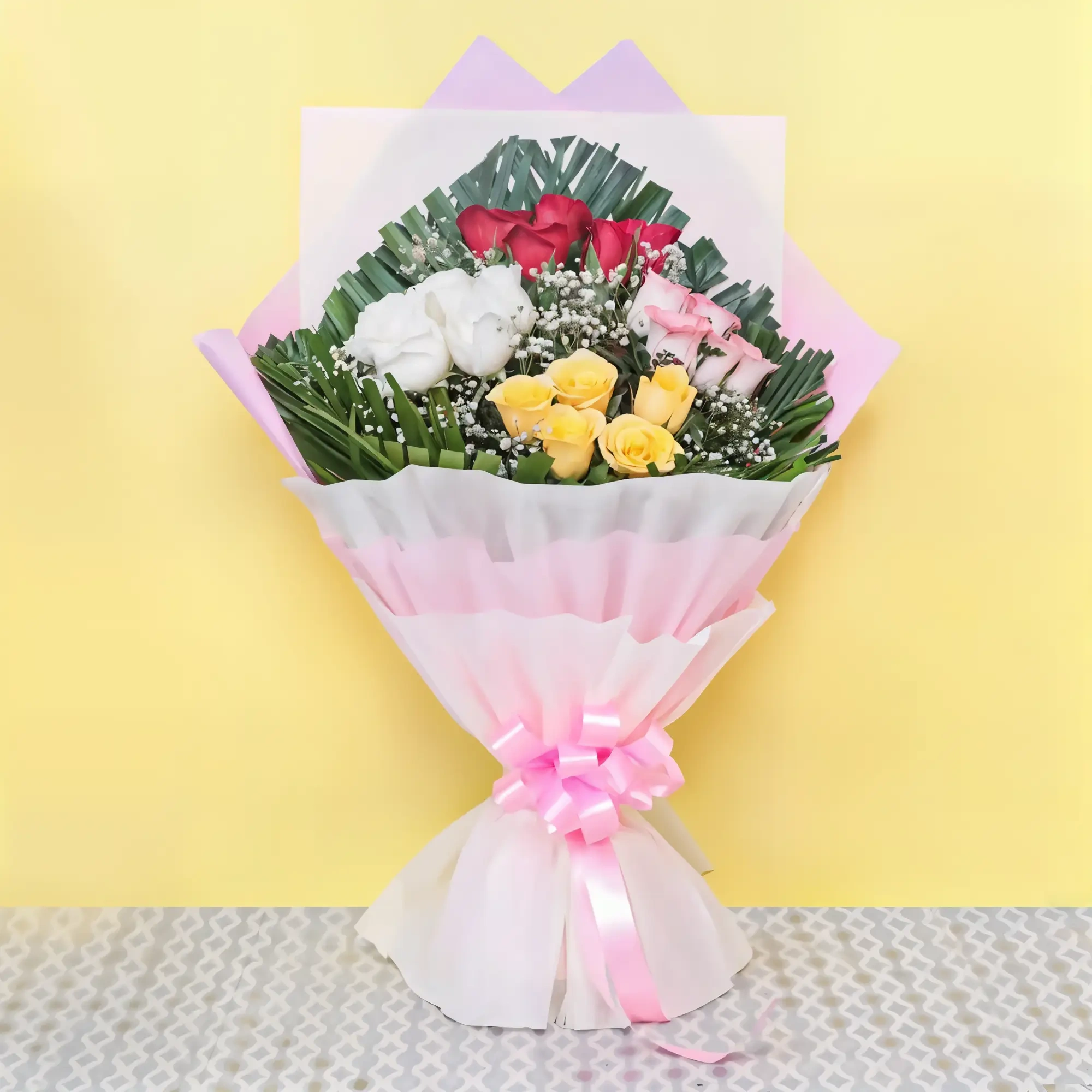 Flowers Contain- 3 Red Rose,3 Yellow Rose,2 White Rose, 2 Pink Rose