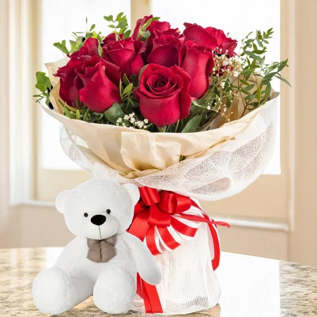 Heart Shaped Arrangement of Red Roses & Teddy Set