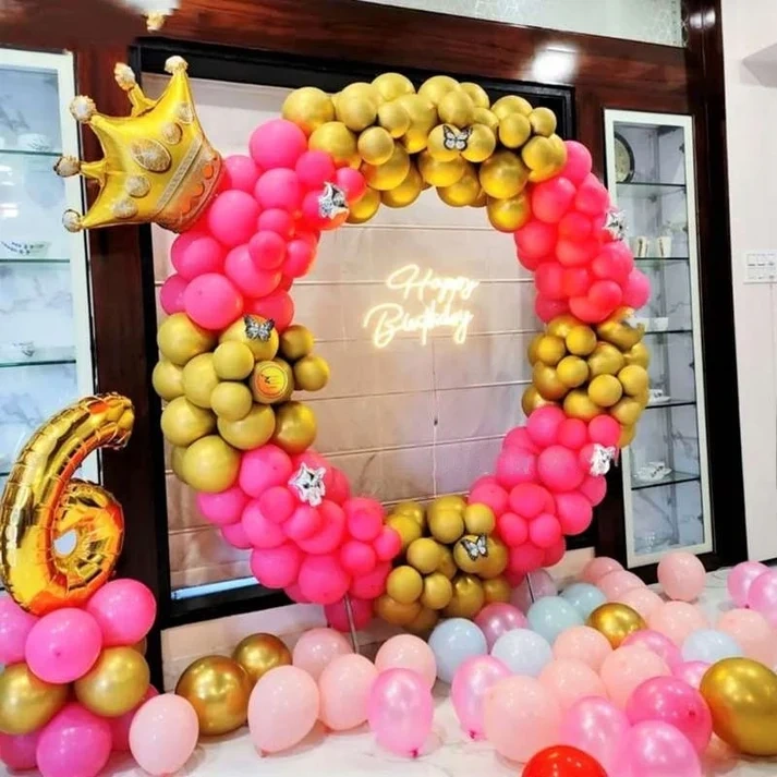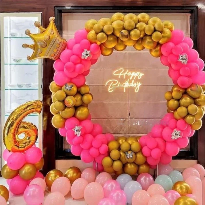 Ring Structure Decorated Pink and Premium Chrome Golden Balloons.