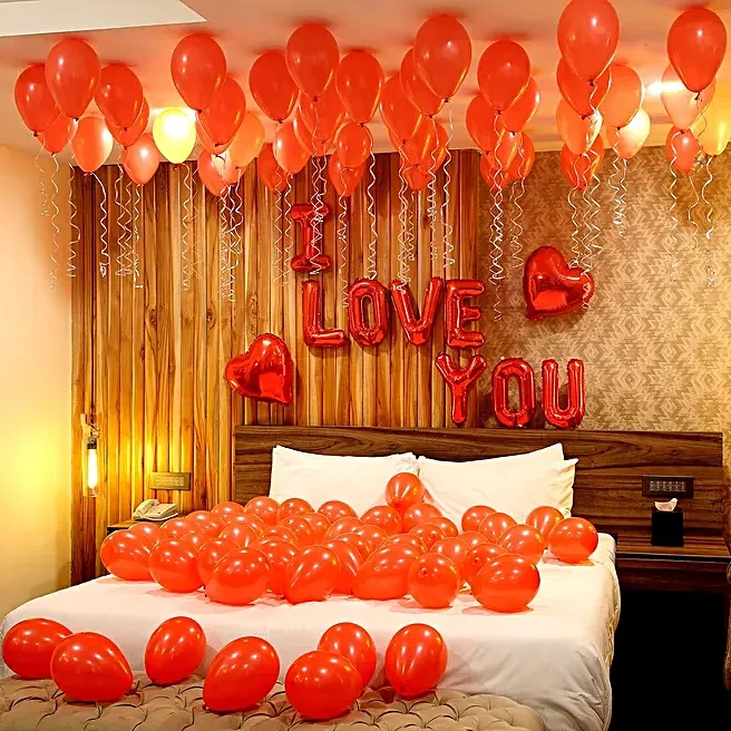 100 Red Balloons Hanging from the ceiling and spread on the bed