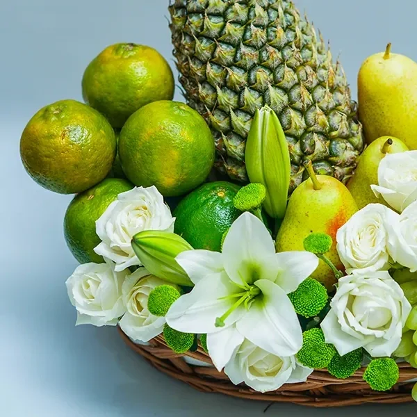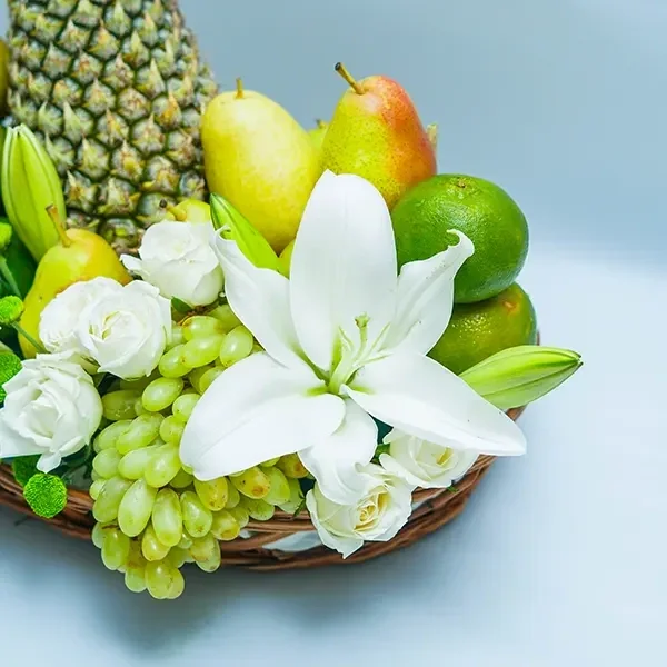 Grand basket featuring 6kg of fresh seasonal fruits and elegant flowers (White Roses, White Lilies, Green Button Daisy)