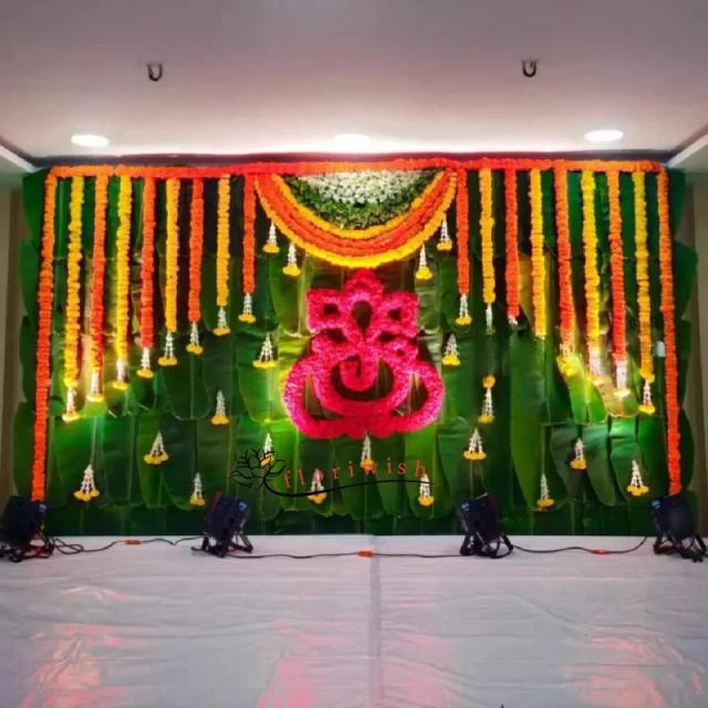 30 Small Real Flowers hanging on Backdrop made with Marigold and Rajnigandha