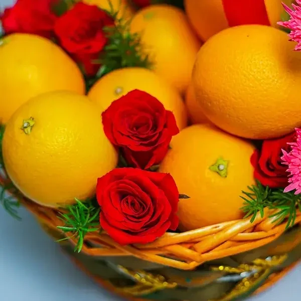 3 kg Oranges, 10 Red Roses, 3 Pink Gerbera in a Handle Basket