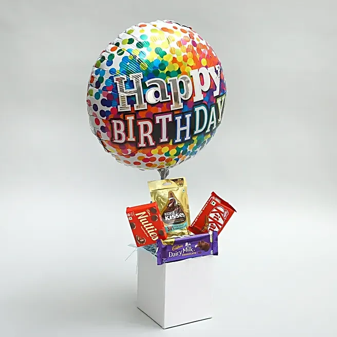 White Square Box with Happy Birthday Printed Round Foil and Blue Paper Fillers